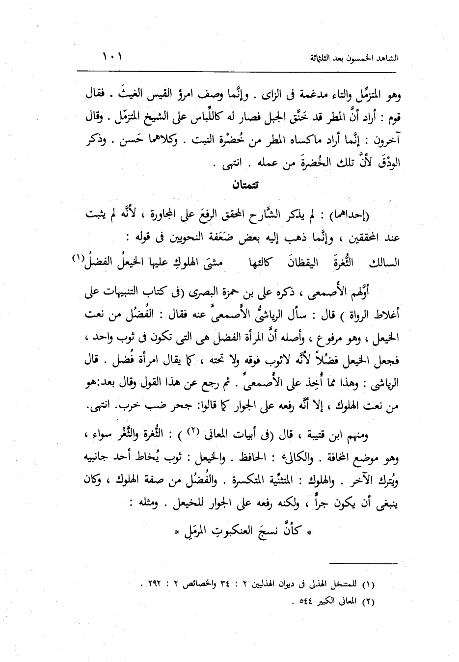 وَمِنْهُم ابْن قُتَيْبَة قَالَ فِي أَبْيَات الْمعَانِي: الثغرة والثغر سَوَاء وَهُوَ مَوضِع المخافة. والكالئ: الْحَافِظ. والخيعل: ثوب يخاط أحد جانبيه وَيتْرك الآخر. والهلوك: المتثنية المتكسرة. وَالْفضل من صفة الهلوك وَكَانَ يَنْبَغِي أَن يكون جراً وَلكنه رَفعه على الْجوَار للخيعل.