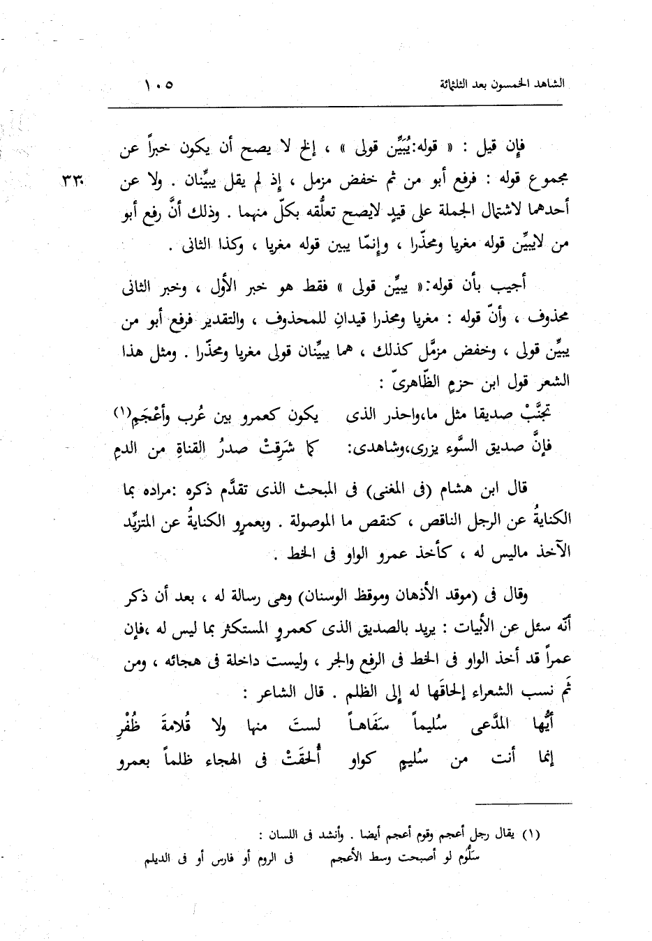 أُجِيب بِأَن قَوْله: يبين قولي فَقَط هُوَ خبر الأول وَخبر الثَّانِي مَحْذُوف وَأَن قَوْله مغرياً ومحذرا قيدان للمحذوف وَالتَّقْدِير فَرفع أَبُو من يبين قولي وخفض مزمل كَذَلِك هما يبينان قولي مغرياً ومحذرا. وَمثل هَذَا الشّعْر قَول ابْن حزم الظَّاهِرِيّ: الطَّوِيل