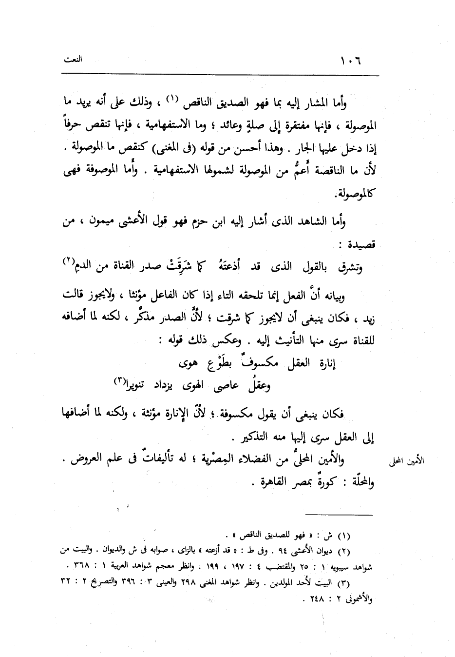 وَهَذَا أحسن من قَوْله فِي الْمُغنِي كنقص مَا الموصولة لِأَن مَا النَّاقِصَة أَعم من الموصولة لشمولها الاستفهامية. وَأما الموصوفة فَهِيَ كالموصولة.