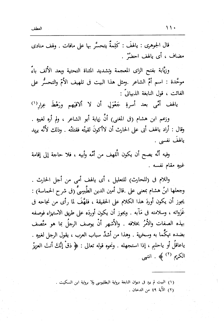 وَزعم ابْن هِشَام فِي الْمُغنِي أَن زيابة أَبُو الشَّاعِر وَلم أره لغيره. وَقَالَ: أَرَادَ يَا لهف أبي على الْحَارِث أَن لَا أكون لَقيته فَقتلته. وَذَلِكَ لِأَنَّهُ يُرِيد يَا لهف نَفسِي.