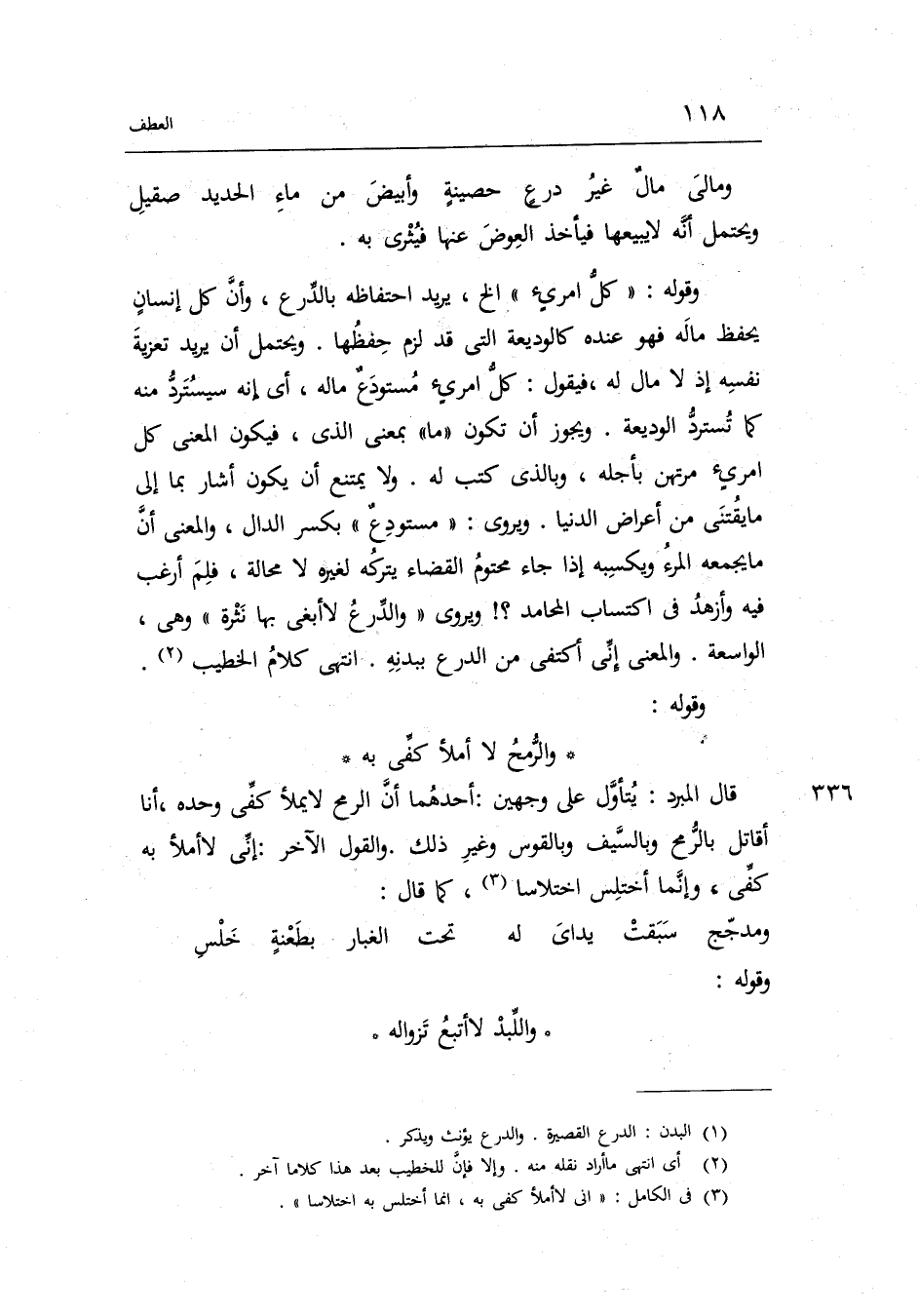وَقَوله: وَالرمْح لَا أملأ كفّي بِهِ قَالَ الْمبرد: يتَأَوَّل على وَجْهَيْن: أَحدهمَا أَن الرمْح لَا يمْلَأ كفي وَحده أَنا أقَاتل بِالرُّمْحِ وبالسيف وبالقوس وَغير ذَلِك. وَالْقَوْل الآخر: إِنِّي لَا أملأ بِهِ كفي إِنَّمَا أختلس بِهِ اختلاساً كَمَا قَالَ: الْكَامِل