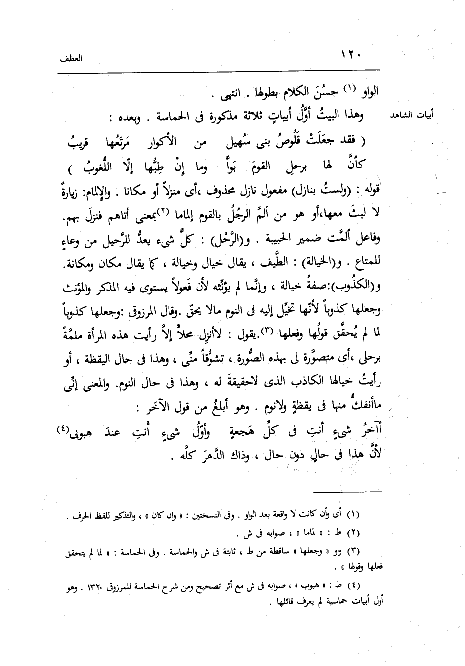 وَقَالَ المرزوقي: وَجعلهَا كذوباً لما لم يُحَقّق قَوْلهَا وفعلها. يَقُول: لَا أنزل محلا إِلَّا رَأَيْت هَذِه الْمَرْأَة ملحمة برحلي اي: متصورة لي بِهَذِهِ الصُّورَة تشوقاً مني وَهَذَا فِي حَال الْيَقَظَة أَو رَأَيْت خيالها الْكَاذِب الَّذِي لَا حَقِيقَة لَهُ وَهَذَا فِي حَال النّوم.
