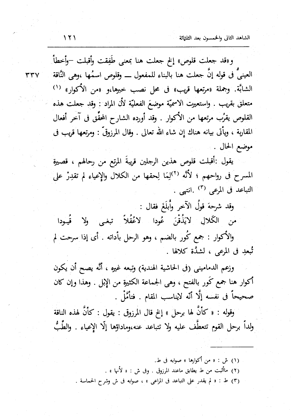 وَقَالَ المرزوقي: ومرتها قريب فِي مَوضِع الْحَال. يَقُول: أَقبلت قلُوص هذَيْن الرجلَيْن قريبَة المرتع من رحالهم قَصِيرَة المسرح فِي رَوَاحهمْ لِأَنَّهُ لما لحقها من الكلال والإعياء لم تقدر على التباعد فِي المرعى. انْتهى.