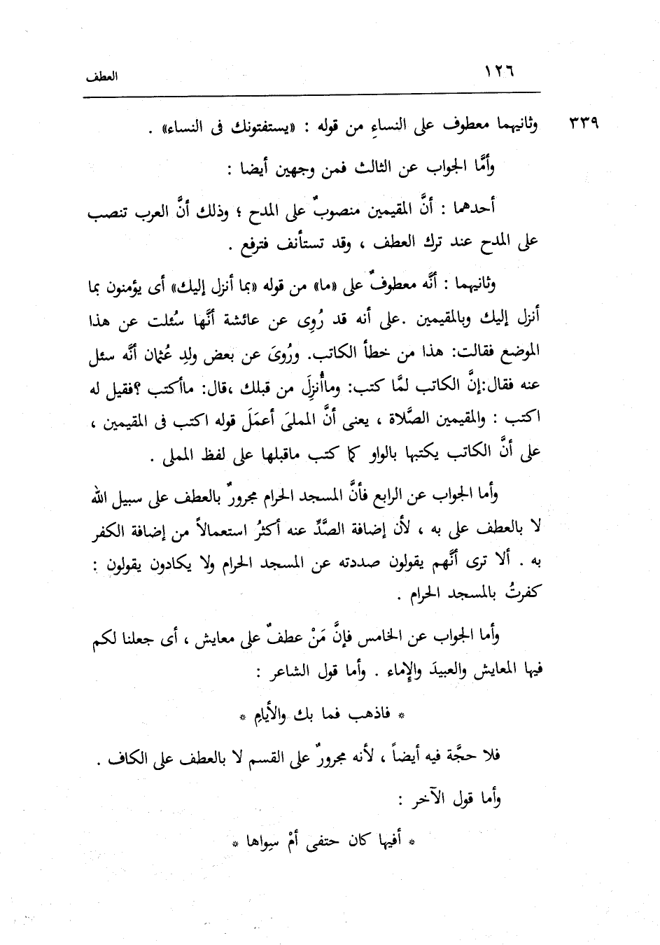 وَرُوِيَ عَن بعض ولد عُثْمَان أَنه سُئِلَ عَنهُ فَقَالَ: إِن الْكَاتِب لما كتب: وَمَا أنزل من قبلك قَالَ: مَا أكتب فَقيل لَهُ: اكْتُبْ والمقيمين الصَّلَاة يَعْنِي أَن المملي أعمل قَوْله اكْتُبْ فِي المقيمين على وَأما الْجَواب عَن الرَّابِع فَإِن الْمَسْجِد الْحَرَام مجرور بالْعَطْف على سَبِيل الله لَا بالْعَطْف على بِهِ لِأَن إِضَافَة الصد عَنهُ أَكثر اسْتِعْمَالا من إِضَافَة الْكفْر بِهِ. أَلا ترى أَنهم يَقُولُونَ: صددته عَن الْمَسْجِد الْحَرَام وَلَا يكادون يَقُولُونَ: كفرت بِالْمَسْجِدِ الْحَرَام.