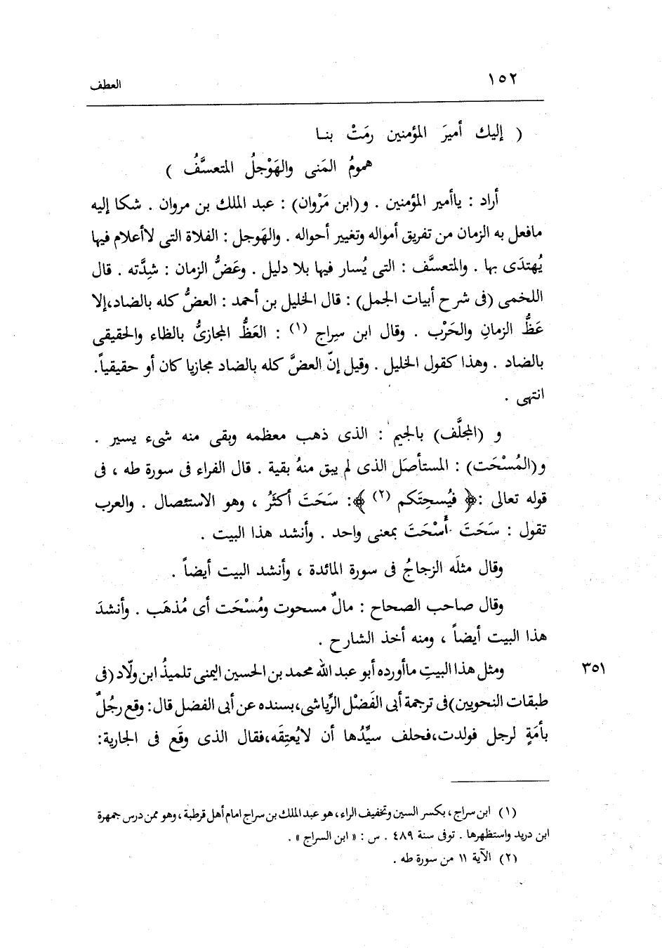 أَرَادَ: يَا أَمِير الْمُؤمنِينَ. وَابْن مَرْوَان: عبد الْملك بن مَرْوَان. شكا إِلَيْهِ مَا فعل بِهِ الزَّمَان من تَفْرِيق أَمْوَاله وتغيير أَحْوَاله. والهوجل: الفلاة الَّتِي لَا أَعْلَام فِيهَا يهتدى بهَا. والمتعسف: الَّتِي يسَار فِيهَا بِلَا دَلِيل. وعض الزَّمَان: شدته.