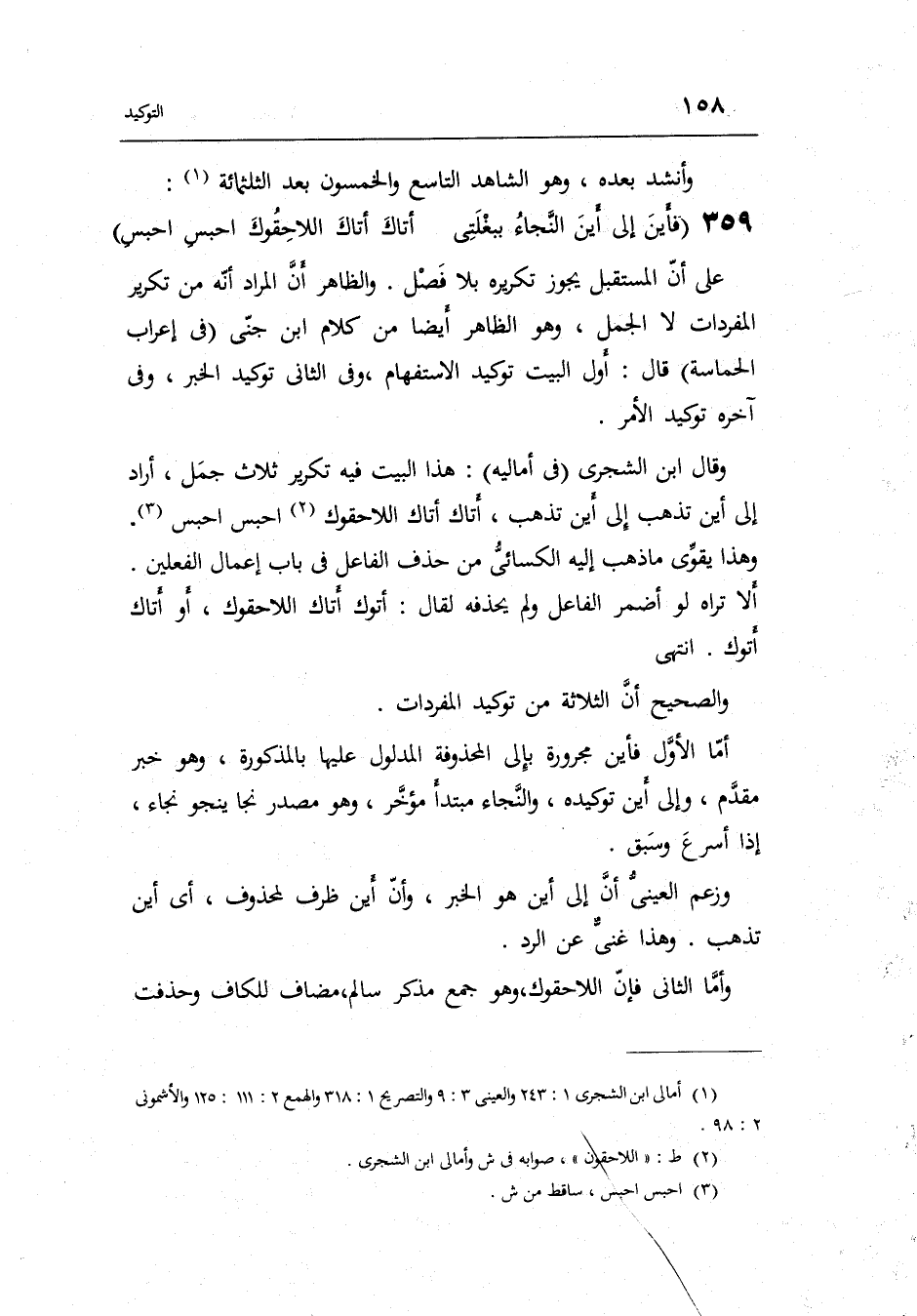 وَقَالَ ابْن الشجري فِي أَمَالِيهِ: هَذَا الْبَيْت فِيهِ تَكْرِير ثَلَاث جمل أَرَادَ إِلَى أَيْن تذْهب إِلَى أَيْن تذْهب أَتَاك أَتَاك اللاحقوك احْبِسْ احْبِسْ وَهَذَا يُقَوي مَا ذهب إِلَيْهِ الْكسَائي من حذف الْفَاعِل فِي بَاب إِعْمَال الْفِعْلَيْنِ. ألآ ترَاهُ لَو أضمر الْفَاعِل. وَلم يحذفه لقَالَ: أتوك أَتَاك اللاحقوك أَو أَتَاك أتوك. انْتهى.