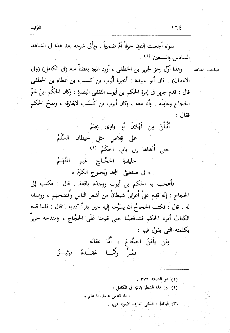 وَهَذَا أول رجز لجرير بن الخطفى أورد الْمبرد بَعْضًا مِنْهُ فِي الْكَامِل وَفِي الاعتنان. قَالَ أَبُو عُبَيْدَة: أخبرنَا أَيُّوب بن كسيب بن عَطاء بن الخطفى قَالَ: قدم جرير فِي إمرة الحكم بن أَيُّوب الثَّقَفِيّ الْبَصْرَة وَكَانَ الحكم ابْن عَم الْحجَّاج وعامله. قَالَ: وَأَنا مَعَه وَكَانَ أَيُّوب بن كسيب لَا يُفَارِقهُ ومدح الحكم فَقَالَ: