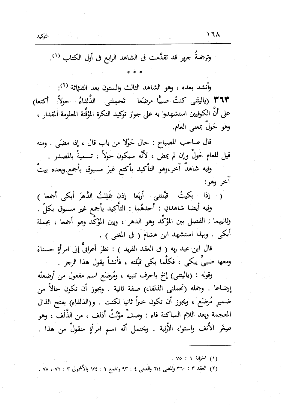 وَفِيه أَيْضا شَاهِدَانِ: أَحدهمَا: التَّأْكِيد بأجمع غير مَسْبُوق بِكُل. وَثَانِيهمَا: الْفَصْل بَين الْمُؤَكّد قَالَ ابْن عبد ربه فِي العقد الفريد: نظر أَعْرَابِي إِلَى امْرَأَة حسناء وَمَعَهَا صبي يبكي فَكلما بَكَى قبلته فَأَنْشَأَ يَقُول هَذَا الرجز.