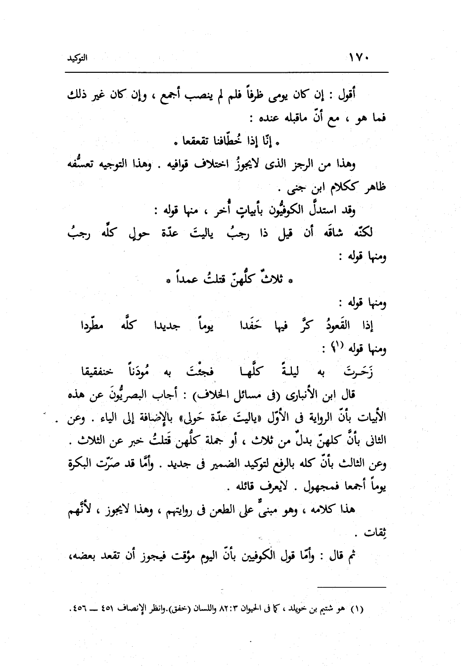 قَالَ ابْن الْأَنْبَارِي فِي مسَائِل الْخلاف: أجَاب البصريون عَن هَذِه الأبيات بِأَن الرِّوَايَة فِي الأول يَا لَيْت عدَّة حَولي بِالْإِضَافَة إِلَى الْيَاء. وَعَن الثَّانِي بِأَن كُلهنَّ بدل من ثَلَاث أَو جملَة كُلهنَّ قتلت خبر عَن الثَّلَاث. وَعَن الثَّالِث بِأَن كُله بِالرَّفْع لتوكيد الضَّمِير فِي جَدِيد. وَأما قد صرت البكرة يَوْمًا أجمعا فمجهول. لَا يعرف قَائِله.