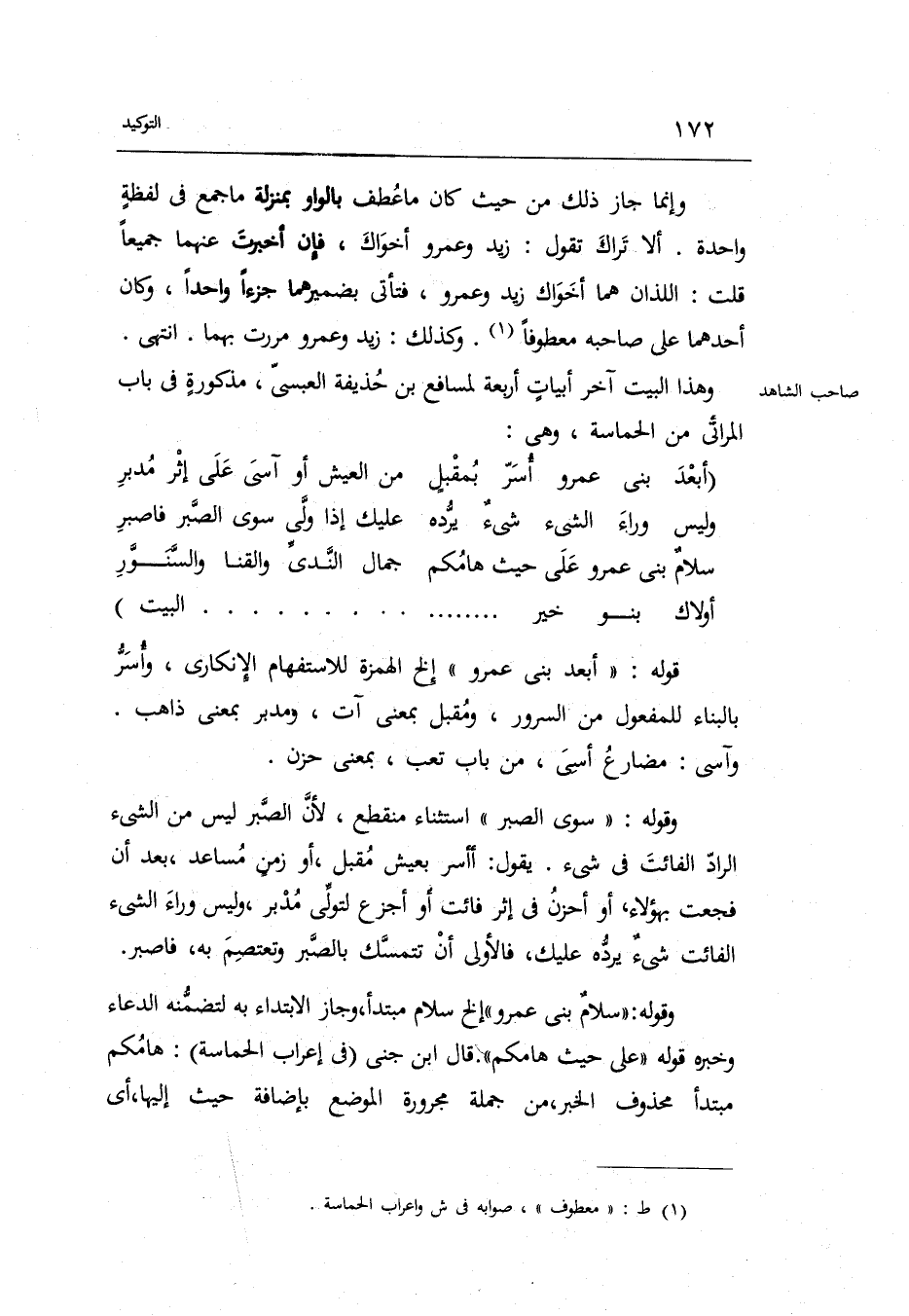 وَقَوله: سوى الصَّبْر اسْتثِْنَاء مُنْقَطع لِأَن الصَّبْر لَيْسَ من الشَّيْء الرَّاد الْفَائِت فِي شَيْء. يَقُول: أأسر بعيش مقبل أَو زمن مساعد بعد أَن فجعت بهؤلاء أَو أَحْزَن فِي إِثْر فَائت أَو أجزع لتولي مُدبر وَلَيْسَ وَرَاء الشَّيْء الْفَائِت شَيْء يردهُ عَلَيْك فَالْأولى أَن تتمسك بِالصبرِ وتعتصم وَقَوله: سَلام بني عَمْرو الخ سَلام مُبْتَدأ وَجَاز الِابْتِدَاء بِهِ لتَضَمّنه الدُّعَاء. وَخَبره قَوْله: على حَيْثُ هامكم.