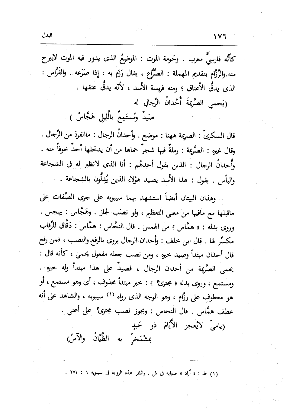 قَالَ ابْن خلف: وأحدان الرِّجَال يرْوى بِالرَّفْع وَالنّصب فَمن رفع قَالَ: أحدان مُبْتَدأ وصيد خَبره وَمن نصب جعله مفعول يحمي كَأَنَّهُ قَالَ: يحمي الصريمة من أحدان الرِّجَال ف صيد على هَذَا مُبْتَدأ وَله خَبره. ومستمع وروى بدله: مجترئ: خبر مُبْتَدأ مَحْذُوف أَي: وَهُوَ مستمع أَو هُوَ مَعْطُوف على رزام وَهُوَ الْوَجْه الَّذِي رَوَاهُ سِيبَوَيْهٍ وَالشَّاهِد على أَنه عطف هماس. قَالَ النّحاس: وَيجوز نصب مجترئ على أَعنِي.