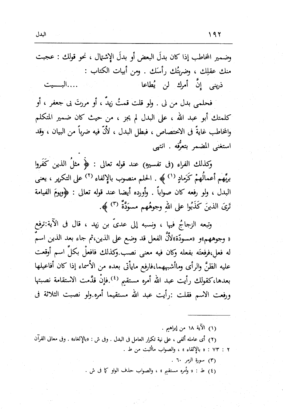 وَكَذَلِكَ الْفراء فِي تَفْسِيره عِنْد قَوْله تَعَالَى: مثلُ الَّذين كَفَروا بربِّهم أعمالُهمْ كَرمادٍ. الْحلم: مَنْصُوب بالإلفاء على التكرير يَعْنِي الْبَدَل وَلَو رَفعه كَانَ صَوَابا. وَأوردهُ أَيْضا عِنْد قَوْله تَعَالَى: ويومَ الْقِيَامَة تَريَ الذينَ كَذَبُوا على اللَّهِ وجوهُهم مسودَّة.