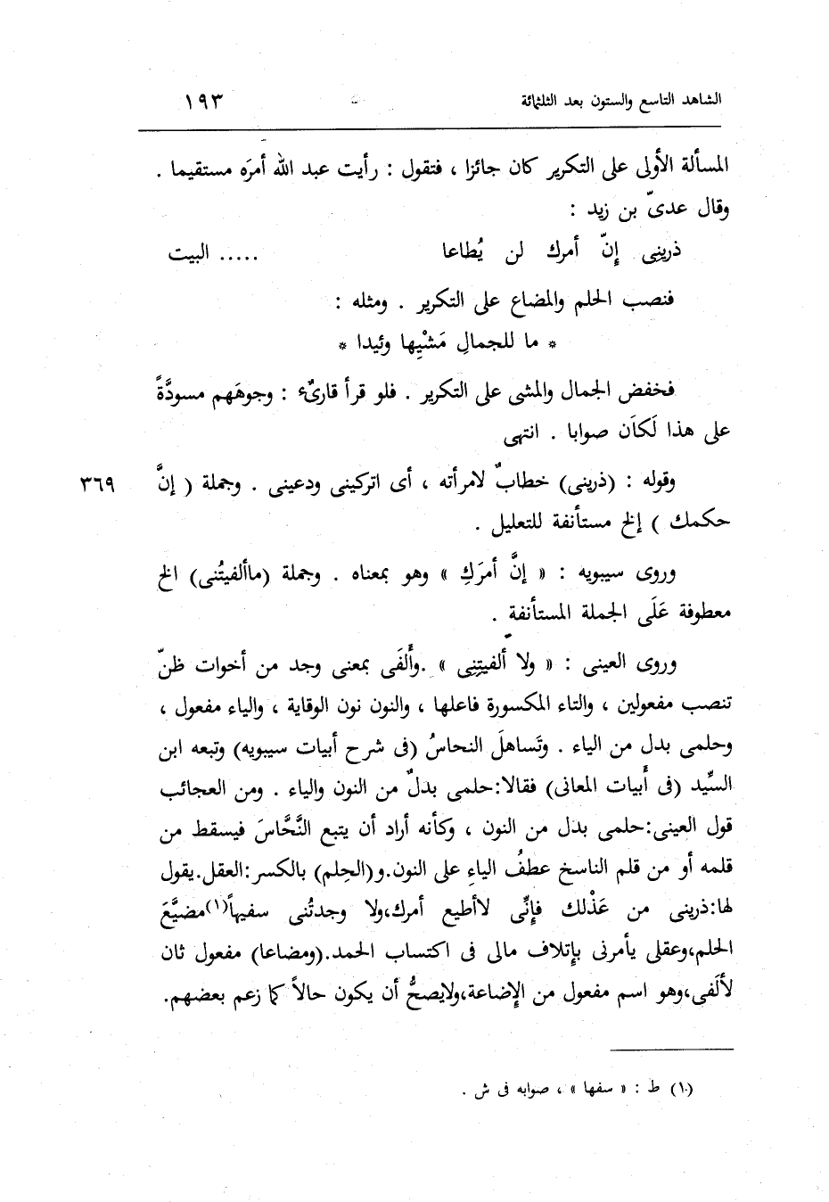 وَمن الْعَجَائِب قَول الْعَيْنِيّ: حلمي بدل من النُّون وَكَأَنَّهُ أَرَادَ أَن يتبع النّحاس فَيسْقط من قلمه أَو من قلم النَّاسِخ عطف الْيَاء على النُّون. والحلم بِالْكَسْرِ: الْعقل.