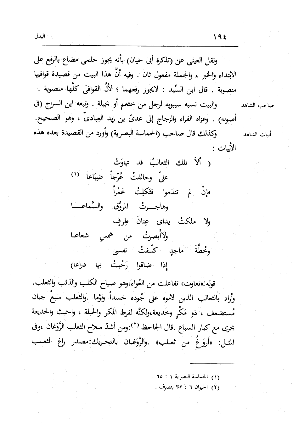 وَنقل الْعَيْنِيّ عَن تذكرة أبي حَيَّان بِأَنَّهُ يجوز حلمي مضاع بِالرَّفْع على الِابْتِدَاء وَالْخَبَر وَالْجُمْلَة مفعول ثَان. وَفِيه أَن هَذَا الْبَيْت من قصيدة قوافيها مَنْصُوبَة.
