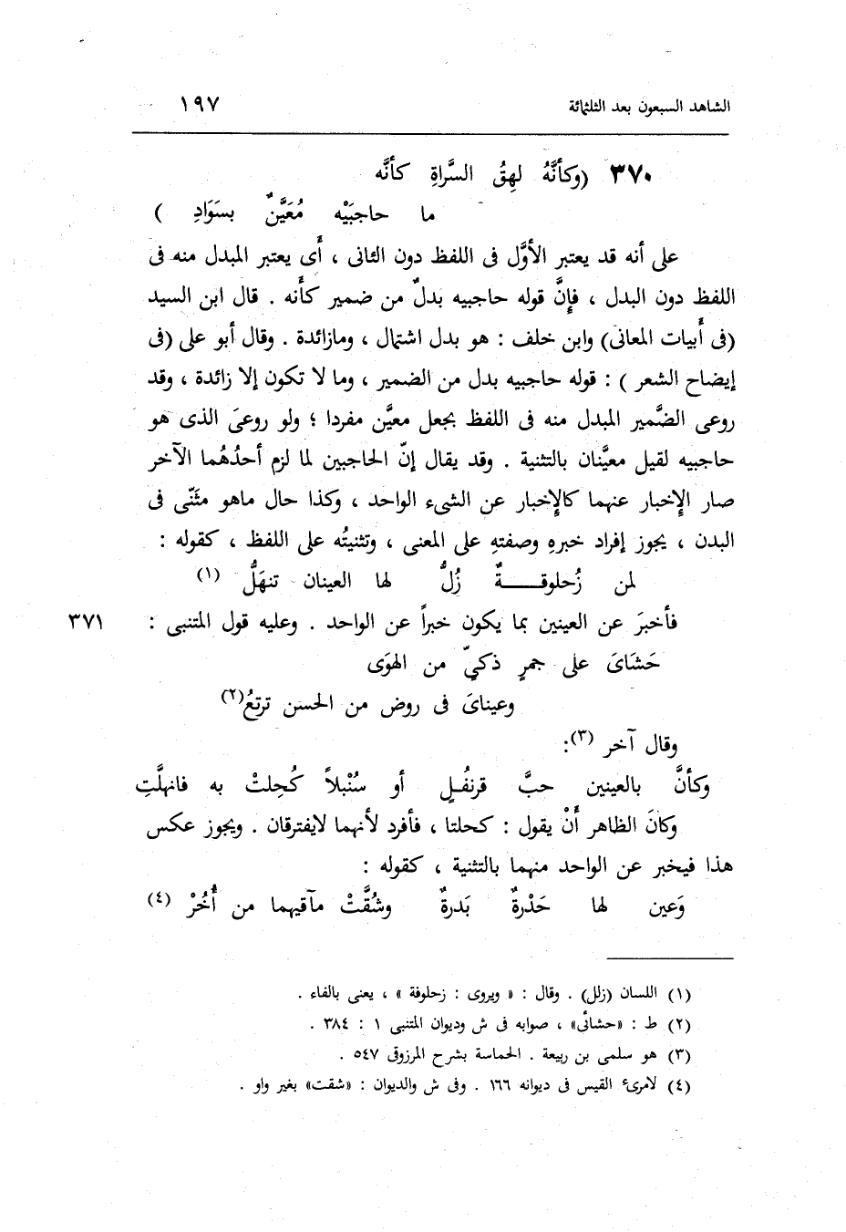 وَقَالَ آخر: الْكَامِل وكأنّ بالعينين حبّ قرنفلٍ أَو سنبلاً كحلت بِهِ فانهلت وَكَانَ الظَّاهِر أَن يَقُول: كحلتا فأفرد لِأَنَّهُمَا لَا يفترقان. وَيجوز عكس هَذَا فيخبر عَن الْوَاحِد مِنْهُمَا بالتثنية كَقَوْلِه: المتقارب