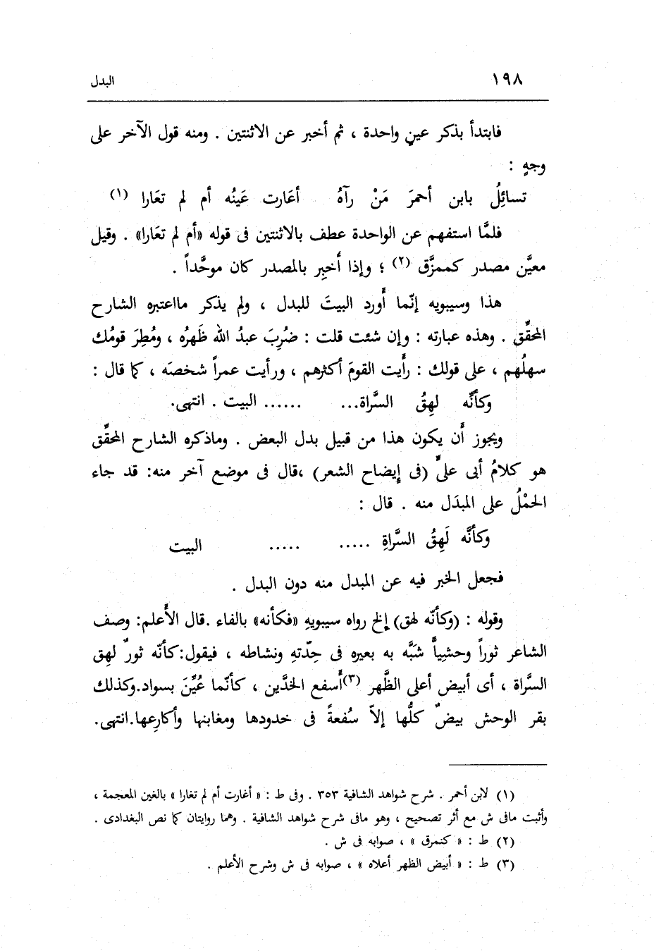 وَيجوز أَن يكون هَذَا من قبيل بدل الْبَعْض. وَمَا ذكره الشَّارِح الْمُحَقق هُوَ كَلَام أبي عَليّ فِي إِيضَاح الشّعْر قَالَ فِي مَوضِع آخر مِنْهُ: قد جَاءَ الْحمل على الْمُبدل مِنْهُ. قَالَ: وكأنّه لهق السّراة ... ... ... ... . . الْبَيْت فَجعل الْخَبَر فِيهِ عَن الْمُبدل مِنْهُ دون الْبَدَل.