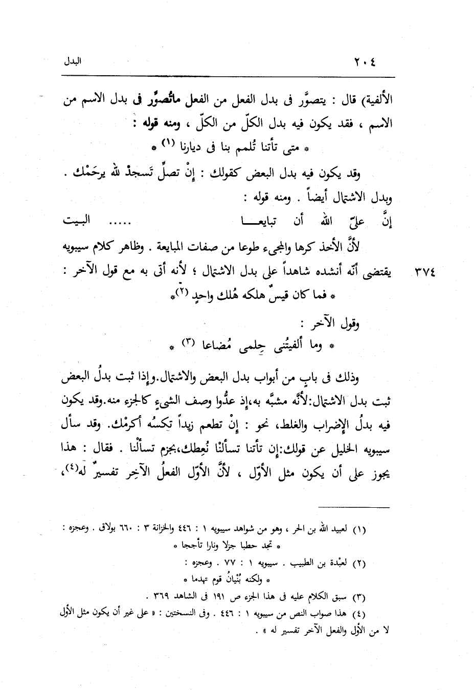 وَمَا ألفيتني حلمي مضاعا وَذَلِكَ فِي بَاب من أَبْوَاب بدل الْبَعْض والاشتمال. وَإِذا ثَبت بدل الْبَعْض ثَبت بدل الاشتمال: لِأَنَّهُ مشبه بِهِ إِذْ عدوا وصف الشَّيْء كالجزء مِنْهُ. وَقد يكون فِيهِ بدل الإضراب والغلط نَحْو إِن تطعم زيدا تكسه أكرمك. وَقد سَأَلَ سِيبَوَيْهٍ الْخَلِيل عَن قَوْلك: إِن تأتنا تسألنا نعطك بجزم تسألنا.