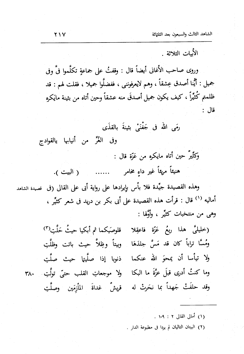 وَكثير حِين أَتَاهُ مَا يكره من عزة قَالَ: هَنِيئًا مريئاً غير دَاء مخامر ... ... ... ... . الْبَيْت وَهَذِه القصيدة جَيِّدَة فَلَا بَأْس بإيرادها على رِوَايَة أبي عَليّ القالي فِي أَمَالِيهِ قَالَ: قَرَأت هَذِه القصيدة على أبي بكر بن دُرَيْد فِي شعر كثير وَهِي من منتخبات كثير وأولها: