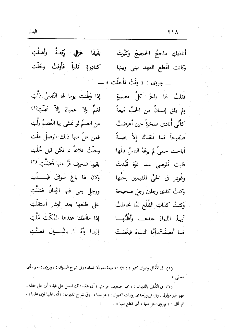 (صفوحاً فَمَا تلقاك إلاّ بخيلةً ... فَمن ملّ مِنْهَا ذَلِك الْوَصْل ملّت)