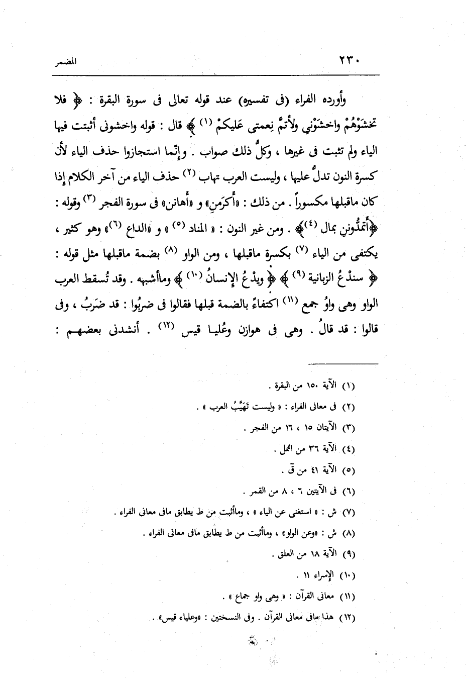 وَأوردهُ الْفراء فِي تَفْسِيره عِنْد قَوْله تَعَالَى فِي سُورَة الْبَقَرَة: فَلَا تخشَوْهُمْ واخشَوْنِي ولأتمَّ نِعمتي عَليكمْ قَالَ: وَقَوله: واخشوني أَثْبَتَت فِيهَا الْيَاء وَلم تثبت فِي غَيرهَا وكل ذَلِك صَوَاب. وَإِنَّمَا استجازوا حذف الْيَاء لِأَن كسرة النُّون تدل عَلَيْهَا وَلَيْسَت الْعَرَب تهاب حذف الْيَاء من آخر الْكَلَام إِذا كَانَ مَا قبلهَا مكسوراً.