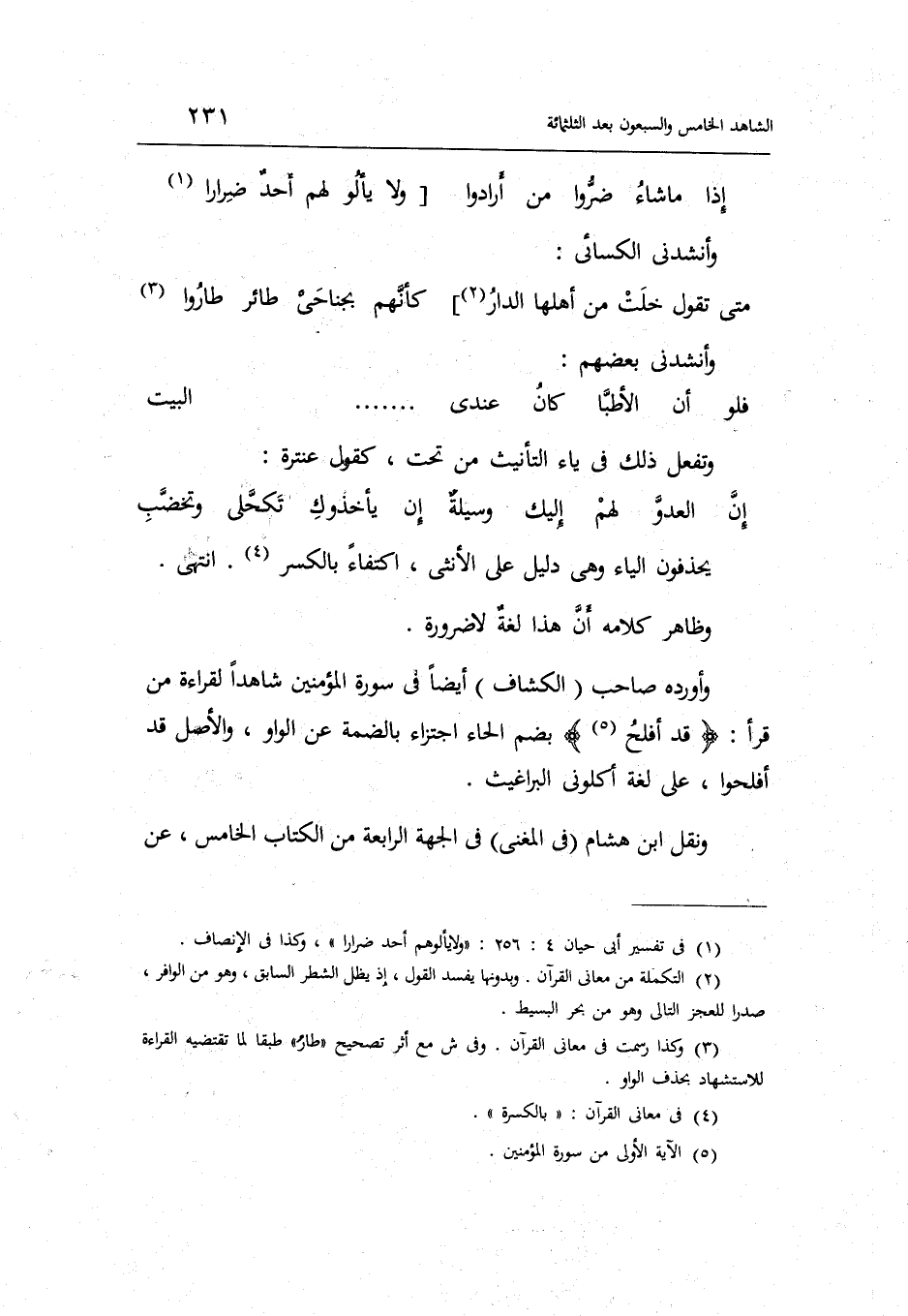 وَأوردهُ صَاحب الْكَشَّاف أَيْضا فِي سُورَة الْمُؤمنِينَ شَاهدا لقِرَاءَة من قَرَأَ: قد أَفْلح بِضَم الْحَاء اجتزاء بالضمة عَن الْوَاو وَالْأَصْل قد أفلحوا على لُغَة أكلوني البراغيث.