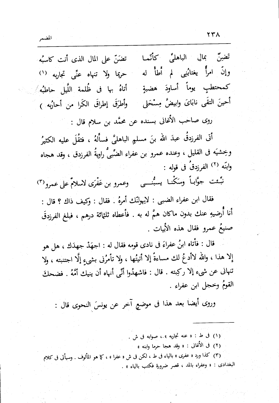 فَقَالَ ابْن عفراء الضَّبِّيّ: لَا يهولنك أمره. فَقَالَ: وَكَيف ذَاك قَالَ: أَنا أرضيه عَنْك بِدُونِ مَا كَانَ هم لَهُ بِهِ. فَأعْطَاهُ ثلثمِائة دِرْهَم فَبلغ الفرزدق صَنِيع عَمْرو فَقَالَ هَذِه الأبيات.
