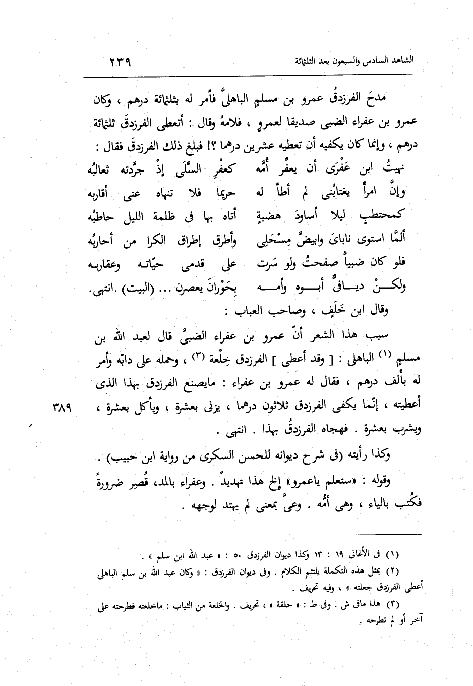 مدح الفرزدق عَمْرو بن مُسلم الْبَاهِلِيّ فَأمر لَهُ بثلثمائة دِرْهَم وَكَانَ عَمْرو بن عفراء الضَّبِّيّ صديقا لعَمْرو فلامه وَقَالَ: أتعطي الفرزدق ثلثمِائة دِرْهَم وَإِنَّمَا كَانَ يَكْفِيهِ أَن تعطيه عشْرين درهما فَبلغ ذَلِك الفرزدق فَقَالَ: الطَّوِيل