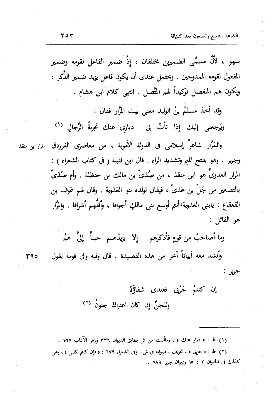 وَقد أَخذ مُسلم بن الْوَلِيد معنى بَيت المرار فَقَالَ: الوافر