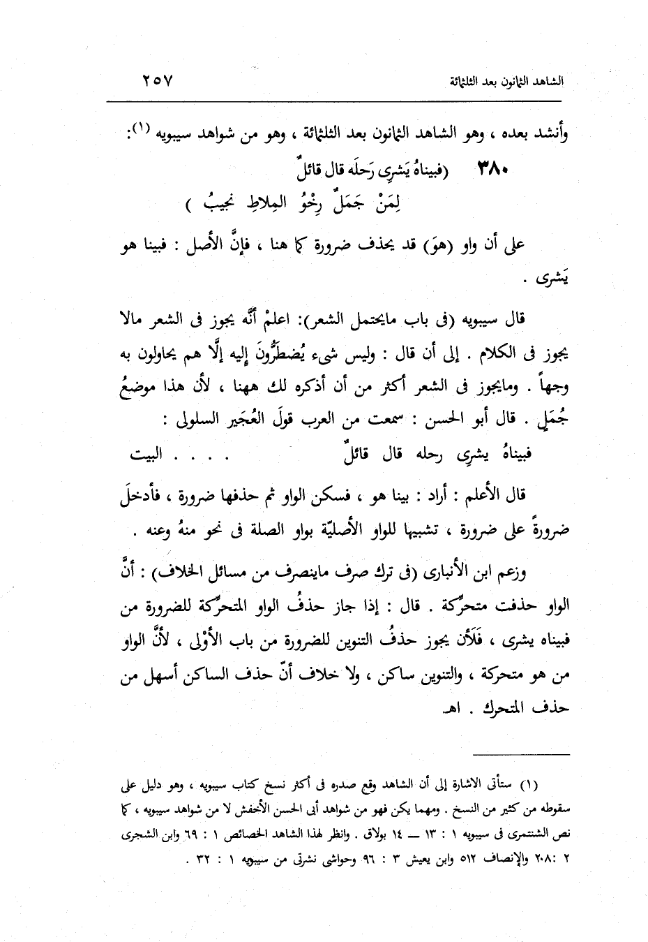 قَالَ: إِذا جَازَ حذف الْوَاو المتحركة للضَّرُورَة من فبيناه يشري فَلِأَن يجوز حذف التَّنْوِين للضَّرُورَة من بَاب الأولى لِأَن الْوَاو من هُوَ متحركة والتنوين سَاكن وَلَا خلاف أَن حذف
