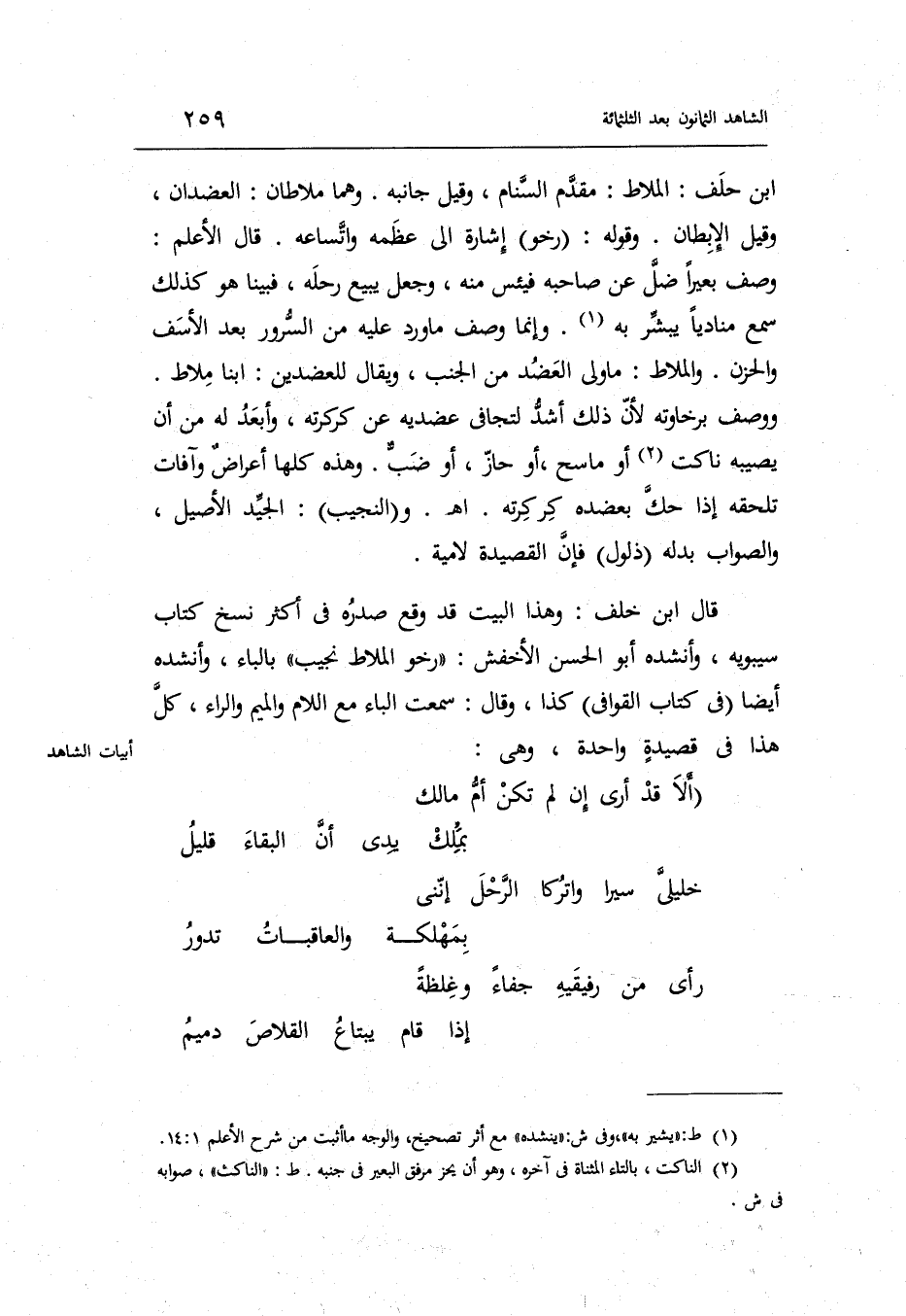 قَالَ ابْن خلف: وَهَذَا الْبَيْت قد وَقع صَدره فِي أَكثر نسخ كتاب سِيبَوَيْهٍ وأنشده أَبُو الْحسن الْأَخْفَش: رخو الملاط نجيب بِالْبَاء وأنشده أَيْضا فِي كتاب القوافي كَذَا وَقَالَ: سَمِعت الْبَاء مَعَ اللَّام وَالْمِيم وَالرَّاء كل هَذَا فِي قصيدة وَاحِدَة وَهِي: