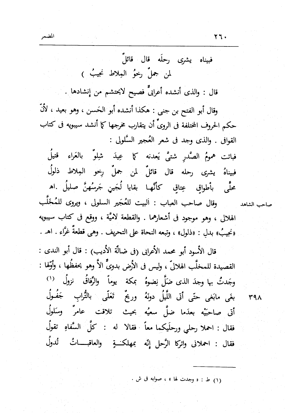 قَالَ: وَالَّذِي أنْشدهُ أَعْرَابِي فصيح لَا يحتشم من إنشادها وَقَالَ أَبُو الْفَتْح بن جني: هَكَذَا أنْشدهُ أَبُو الْحسن وَهُوَ بعيد لِأَن حكم الْحُرُوف الْمُخْتَلفَة فِي الروي أَن يتقارب مخرجها كَمَا أنْشد سِيبَوَيْهٍ فِي كتاب القوافي. وَالَّذِي وجد فِي شعر العجير السَّلُولي: