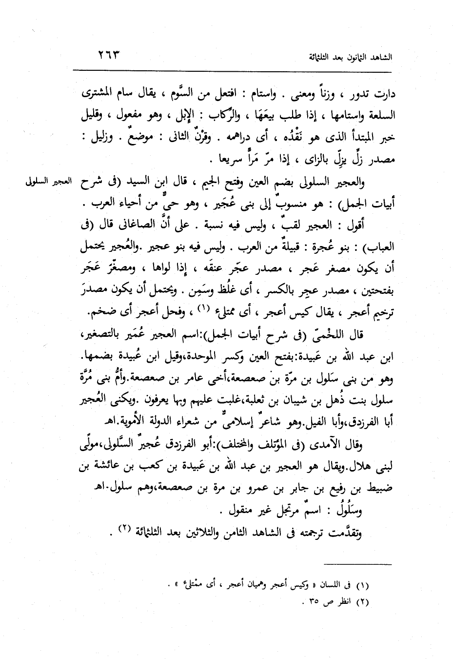 أَقُول: العجير لقب وَلَيْسَ فِيهِ نِسْبَة. على أَن الصَّاغَانِي قَالَ فِي الْعباب: بَنو عجْرَة قَبيلَة من الْعَرَب. وَلَيْسَ فِيهِ بَنو عجير. والعجير يحْتَمل أَن يكون مصغر عجر مصدر عجر عُنُقه إِذا لواها ومصغر عجر بِفتْحَتَيْنِ مصدر عجر بِالْكَسْرِ أَي: غلظ وَسمن. وَيحْتَمل أَن يكون مصدر ترخيم أعجر يُقَال: كيس أعجر أَي: ممتلئ وفحل أعجر أَي: ضخم.