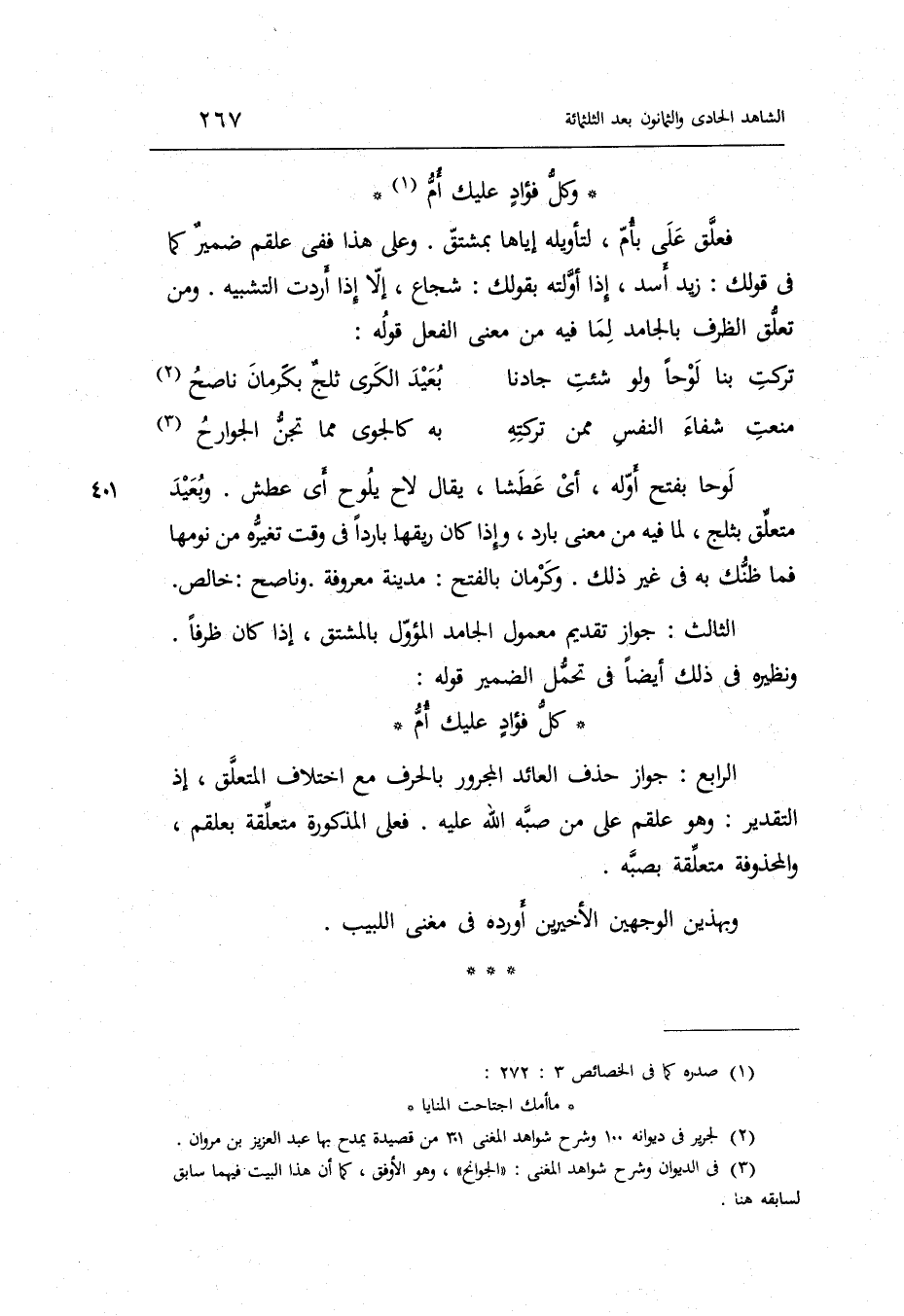 كلّ فؤادٍ عَلَيْك أمّ الرَّابِع: جَوَاز حذف الْعَائِد الْمَجْرُور بالحرف مَعَ اخْتِلَاف الْمُتَعَلّق إِذْ التَّقْدِير وَهُوَ علقم على من صبه الله عَلَيْهِ. فعلى الْمَذْكُورَة مُتَعَلقَة بعلقم والمحذوفة مُتَعَلقَة بصبه.