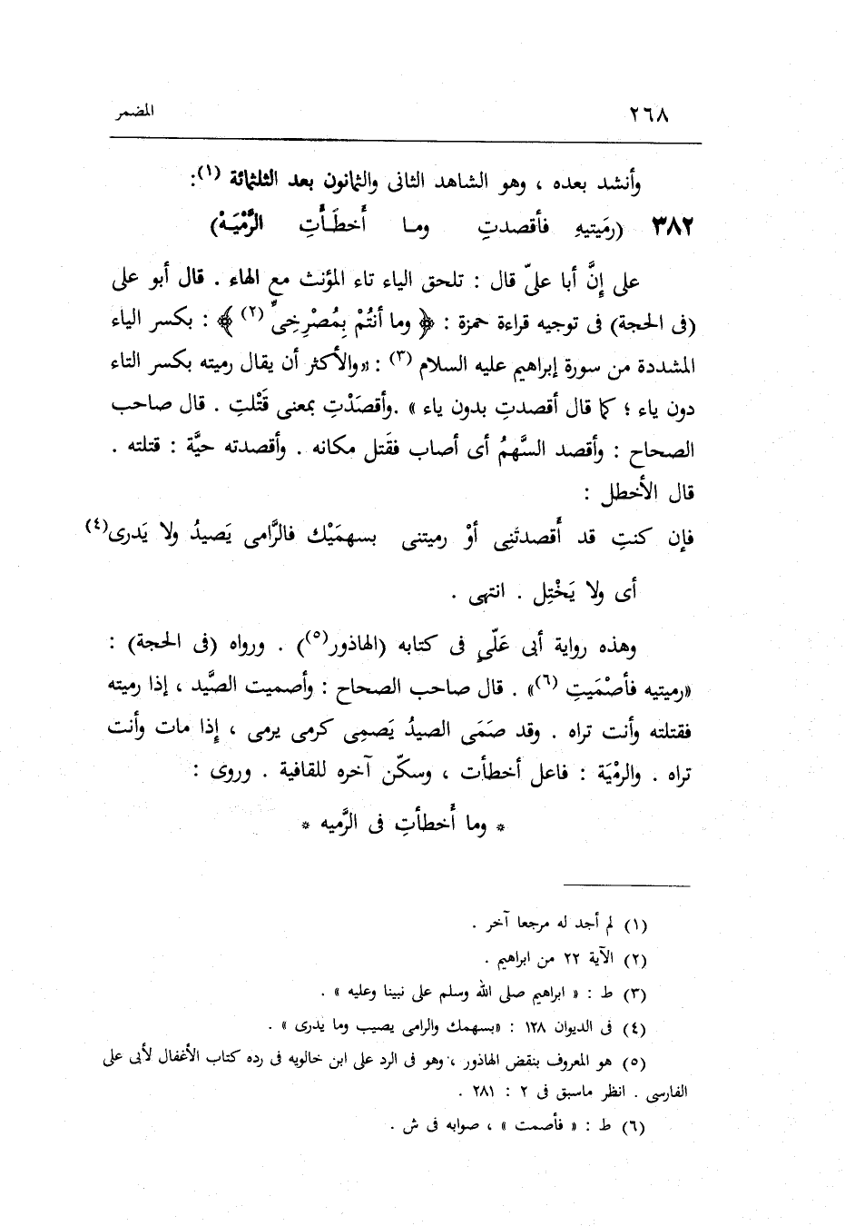 على أَن أَبَا عَليّ قَالَ: تلْحق الْيَاء تَاء الْمُؤَنَّث مَعَ الْهَاء. قَالَ أَبُو عَليّ فِي الْحجَّة فِي تَوْجِيه قِرَاءَة حَمْزَة: وَمَا أَنْتُم بمصرخي: بِكَسْر الْيَاء الْمُشَدّدَة من سُورَة إِبْرَاهِيم عَلَيْهِ السَّلَام: وَالْأَكْثَر أَن يُقَال رميته بِكَسْر التَّاء دون يَاء كَمَا قَالَ أقصدت بِدُونِ يَاء. وأقصدت: بِمَعْنى قتلت.