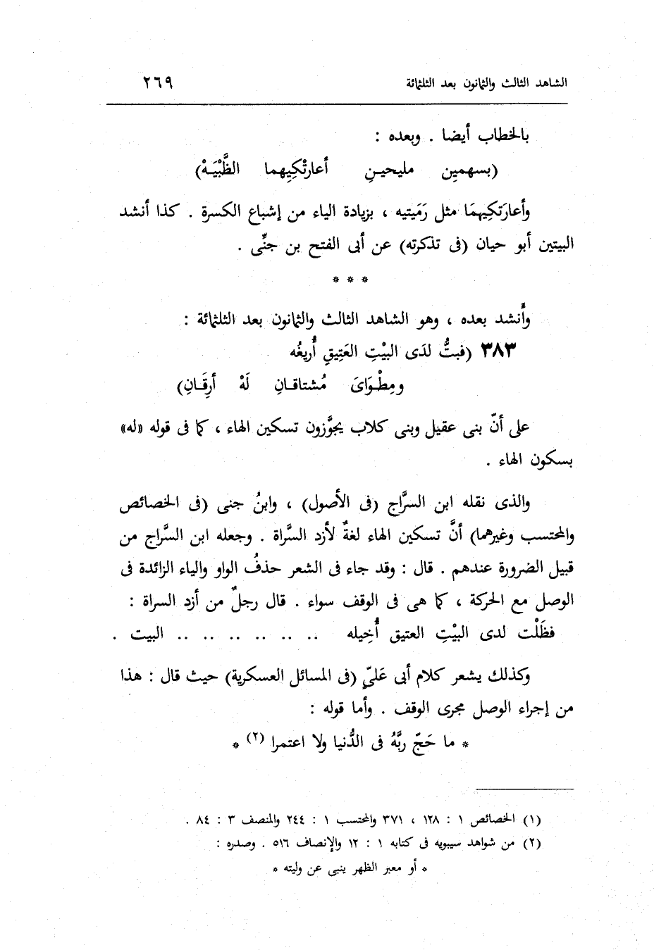 الشَّاهِد الثَّالِث وَالثَّمَانُونَ بعد الثلاثمائة الطَّوِيل على أَن بني عقيل وَبَين كلاب يجوزون تسكين الْهَاء كَمَا فِي قَوْله لَهُ بِسُكُون الْهَاء.