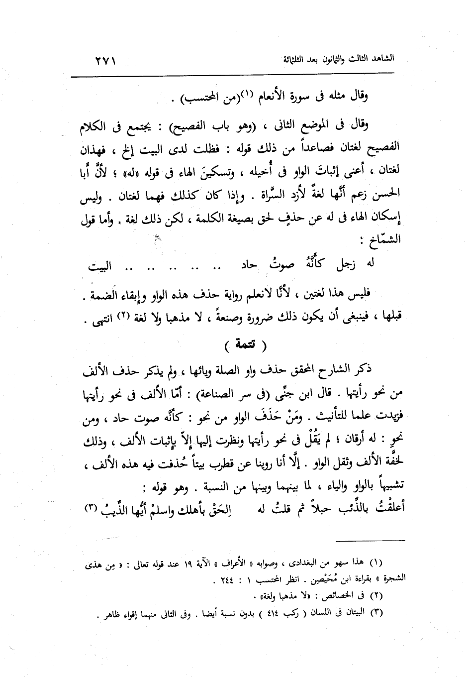 تَتِمَّة ذكر الشَّارِح الْمُحَقق حذف وَاو الصِّلَة ويائها وَلم يذكر حذف الْألف من نَحْو رَأَيْتهَا. قَالَ ابْن جني فِي سر الصِّنَاعَة: أما الْألف فِي نَحْو: رَأَيْتهَا فزيدت علما للتأنيث. وَمن حذف الْوَاو من نَحْو: كَأَنَّهُ صَوت حاد وَمن نَحْو: لَهُ أرقان لم يقل فِي نَحْو: رَأَيْتهَا وَنظرت إِلَيْهَا إِلَّا بِإِثْبَات الْألف وَذَلِكَ لخفة الْألف وَثقل الْوَاو. إِلَّا أَنا روينَا عَن قطرب بَيْتا حذفت فِيهِ هَذِه الْألف تَشْبِيها بِالْوَاو وَالْيَاء لما بَينهمَا وَبَينهَا من النِّسْبَة.
