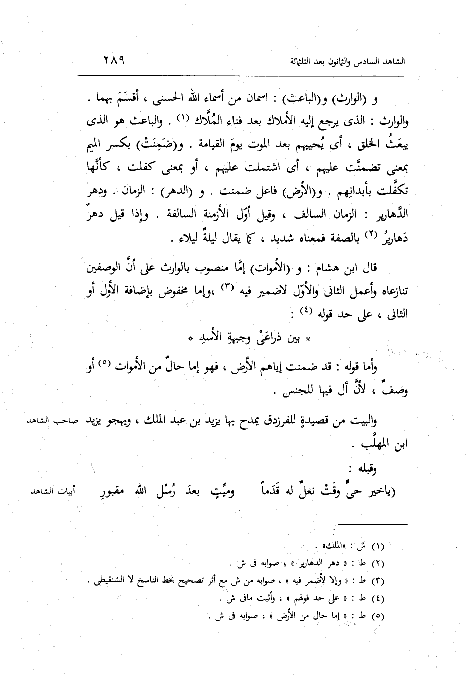 قَالَ ابْن هِشَام: والأموات إِمَّا مَنْصُوب بالوارث على أَن الوصفين تنازعاه وأعمل الثَّانِي وَالْأول لَا ضمير فِيهِ وَإِمَّا مخفوض بِإِضَافَة الأول أَو الثَّانِي على حد قَوْله: المنسرح بَين ذراعي وجبهة الْأسد وَأما قَوْله: قد ضمنت إيَّاهُم الأَرْض فَهُوَ إِمَّا حَال من الْأَمْوَات أَو وصف لَهَا لِأَن أل فِيهَا للْجِنْس.)