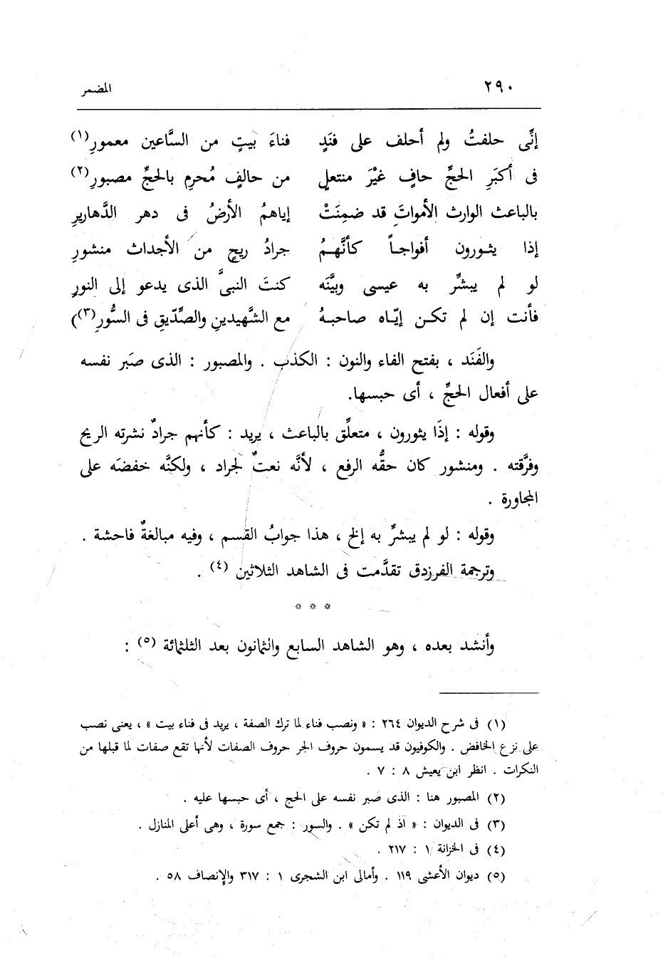 (إنّي حَلَفت وَلم أَحْلف على فندٍ ... فنَاء بيتٍ من السّاعين معمور)