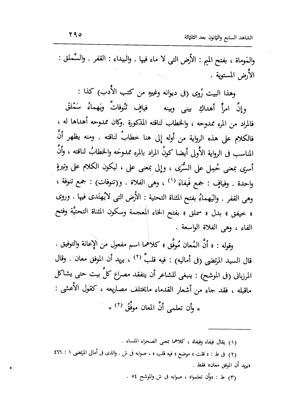 وفياف: جمع فيفاء وَهِي الفلاة. وتنوفات: جمع تنوفة وَهِي القفر واليهماء بِفَتْح الْمُثَنَّاة التَّحْتِيَّة: الأَرْض الَّتِي لَا يهتدى فِيهَا. وَرُوِيَ: خيفق بدل سملق بِفَتْح الْخَاء الْمُعْجَمَة وَسُكُون الْمُثَنَّاة التَّحْتِيَّة وَفتح الْفَاء وَهِي الفلاة الواسعة.