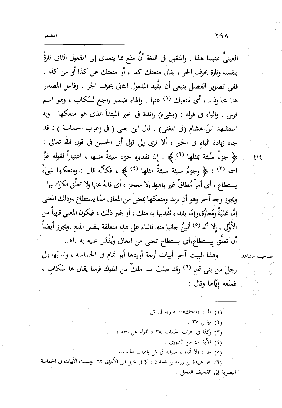 قَالَ ابْن جني فِي إِعْرَاب الحماسة: قد جَاءَ زِيَادَة الْبَاء فِي الْخَبَر أَلا ترى إِلَى قَول أبي الْحسن فِي قَول الله تَعَالَى: جزاءٌ سيِّئةٍ بِمِثْلِهَا إِن تَقْدِيره جَزَاء سَيِّئَة سَيِّئَة مثلهَا اعْتِبَارا لقَوْله عز اسْمه: وجَزاء سَيئةٍ سَيِّئةٌ مثلُها فَكَأَنَّهُ قَالَ: ومنعكها شَيْء يُسْتَطَاع أَي: أَمر مطاق غير باهظ وَلَا معجز أَي: فاله عَنْهَا وَلَا تعلق فكرك بهَا.