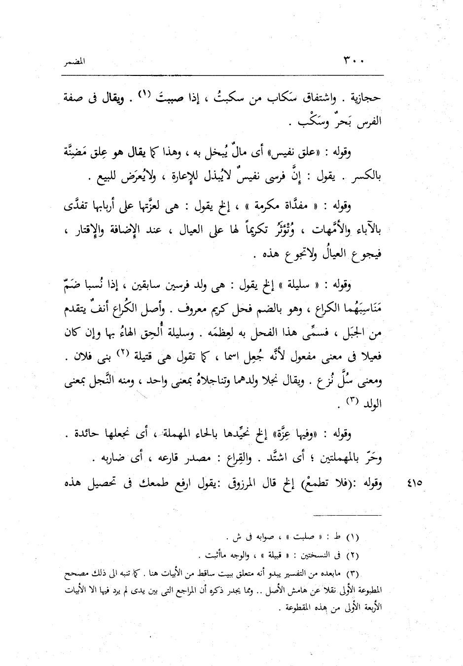 وَقَوله: سليلة الخ يَقُول: هِيَ ولد فرسين سابقين إِذا نسبا ضم مناسبهما الكراع وَهُوَ بِالضَّمِّ فَحل كريم مَعْرُوف. وأصل الكراع أنف يتَقَدَّم من الْجَبَل فَسُمي هَذَا الْفَحْل بِهِ لعظمه.