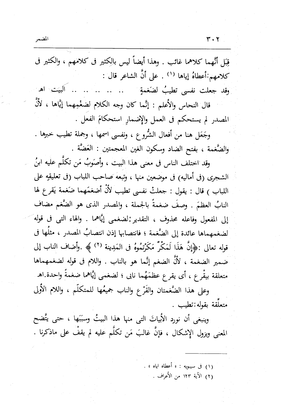وَقد اخْتلف النَّاس فِي معنى هَذَا الْبَيْت وأصوب من تكلم عَلَيْهِ ابْن الشجري فِي أَمَالِيهِ فِي موضِعين مِنْهَا وَتَبعهُ صَاحب اللّبَاب فِي تَعْلِيقه على اللّبَاب قَالَ: يَقُول: جعلت نَفسِي تطيب لِأَن وصف ضغمة بِالْجُمْلَةِ والمصدر الَّذِي هُوَ الضغم مُضَاف إِلَى الْمَفْعُول وفاعله مَحْذُوف التَّقْدِير: لضغمي إيَّاهُمَا.