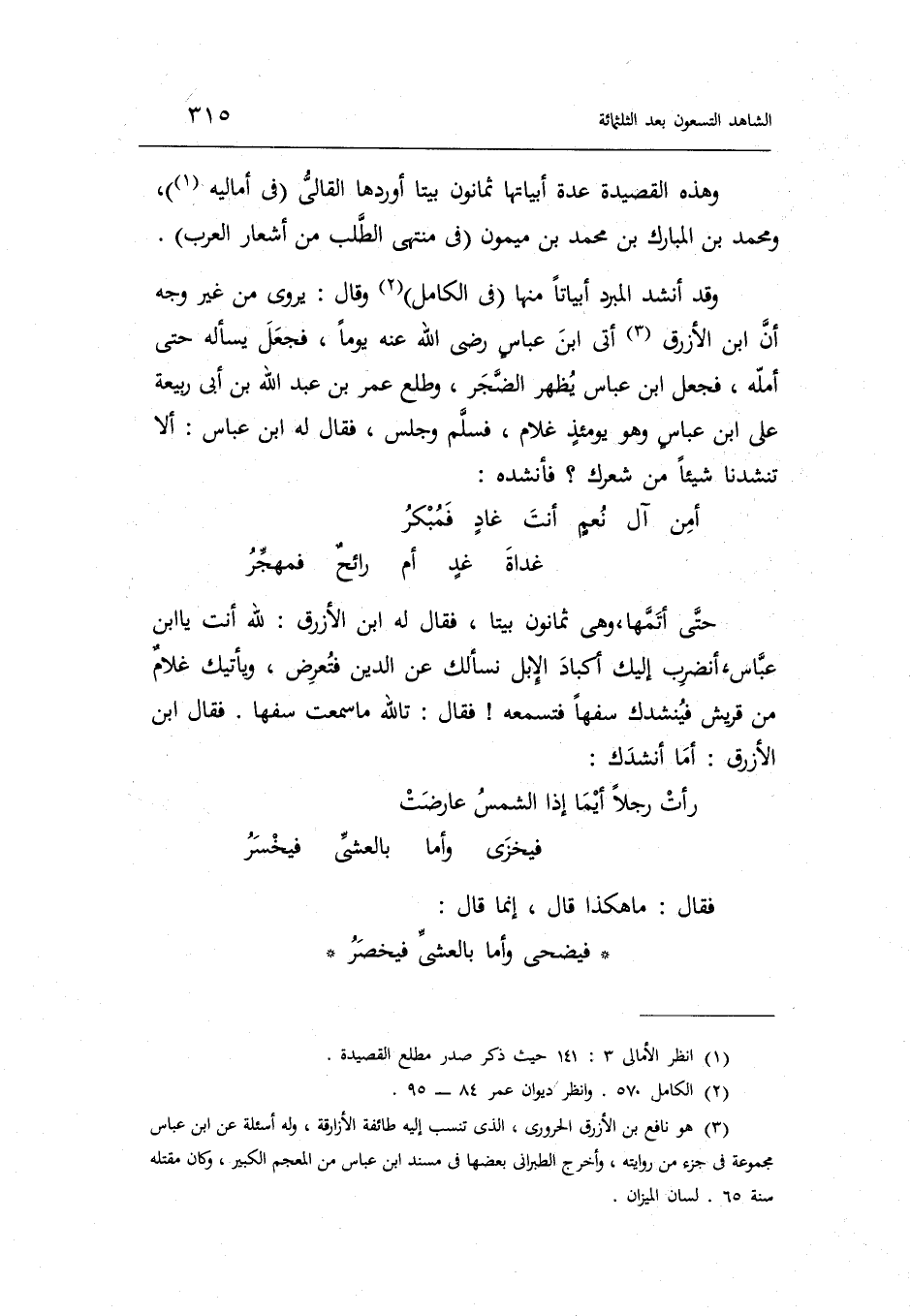 الْأَزْرَق أَتَى ابْن عَبَّاس رَضِيَ اللَّهُ عَنْه يَوْمًا فَجعل يسْأَله حَتَّى أمله فَجعل ابْن عَبَّاس يظْهر الضجر وطلع عمر بن عبد الله بن أبي ربيعَة على ابْن عَبَّاس وَهُوَ يَوْمئِذٍ غُلَام فَسلم وَجلسَ فَقَالَ لَهُ ابْن عَبَّاس: أَلا تنشدنا شَيْئا من شعرك فأنشده: الطَّوِيل
