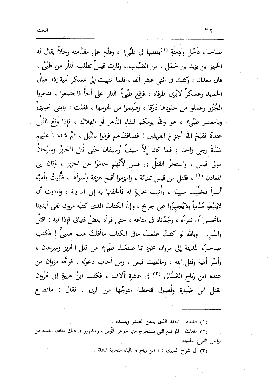 وَبِاللَّهِ لَو كنت علمت مَا فِي الْكتاب مَا أفلت مِنْهُم صبي فَكتب صَاحب الْمَدِينَة إِلَى مَرْوَان يُخبرهُ بِمَا صنعت طَيئ من قتل الحريز وسرحان وَأسر أُميَّة وَقتل ابْنه وَمَا لقِيت قيس وَمن أجَاب دَعوته. فَوجه مَرْوَان من عِنْده ابْن رَبَاح الغساني فِي عشرَة آلَاف فَكتب ابْن هُبَيْرَة إِلَى مَرْوَان بقتل ابْن ضبارة وفصول قَحْطَبَةَ مُتَوَجها من الرّيّ.)