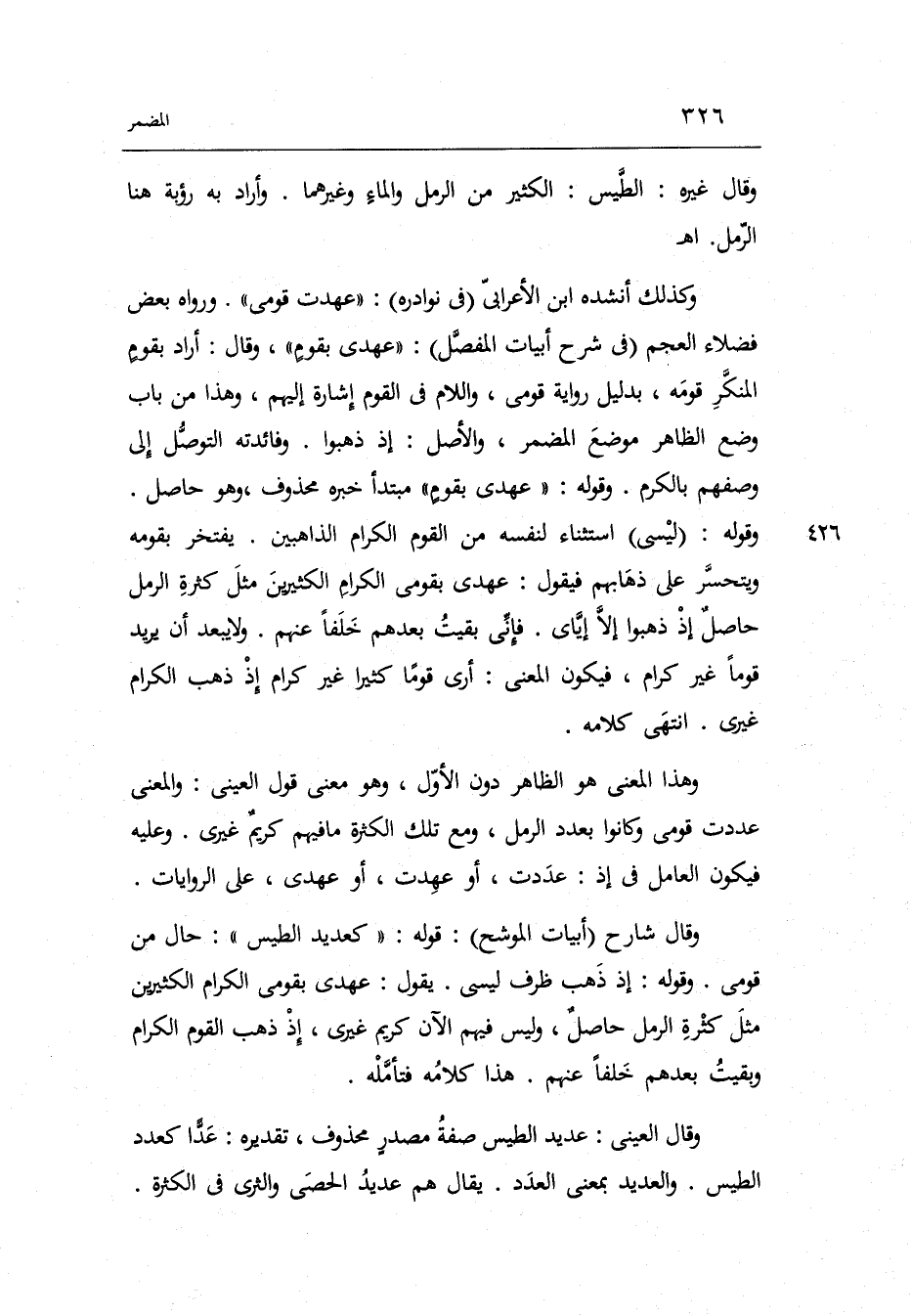 وَكَذَلِكَ أنْشدهُ ابْن الْأَعرَابِي فِي نوادره: عهِدت قومِي. وَرَوَاهُ بعض فضلاء الْعَجم فِي شرح أَبْيَات الْمفصل: عهدي بِقوم. وَقَالَ: أَرَادَ بِقوم