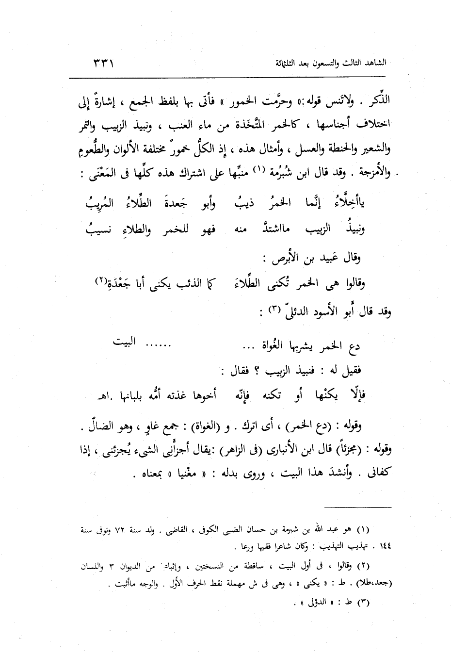 وَقد قَالَ أَبُو الْأسود الدئلي: دع الْخمر يشْربهَا الغواة ... ... ... ... ... ... . الْبَيْت