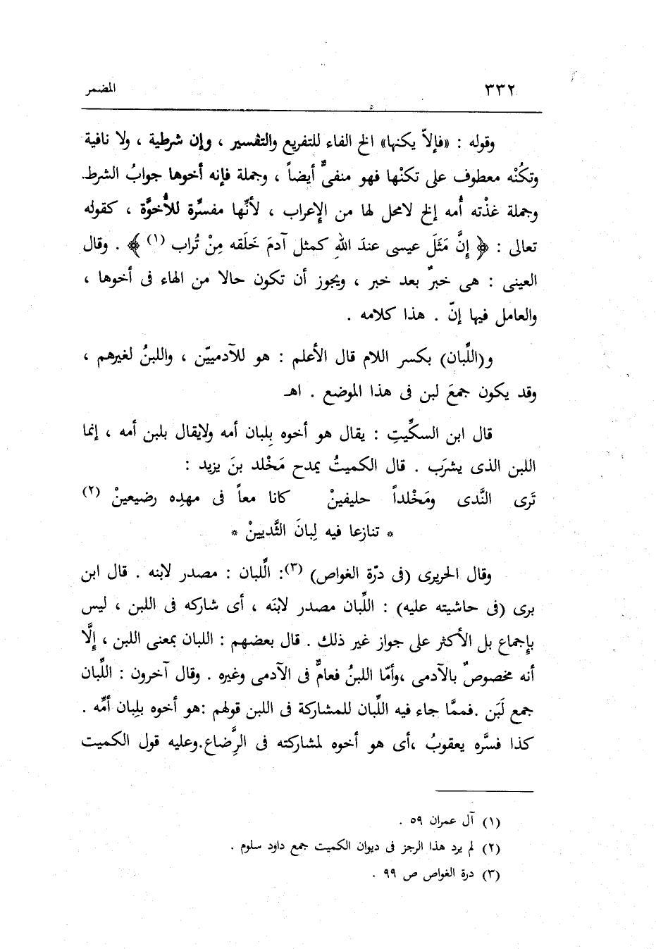 وَقَالَ آخَرُونَ: اللبان جمع لبن. فمما جَاءَ فِيهِ اللبان للمشاركة فِي اللَّبن قَوْلهم: هُوَ أَخُوهُ بلبان أمه. كَذَا فسره يَعْقُوب أَي: هُوَ أَخُوهُ لمشاركته فِي الرَّضَاع. وَعَلِيهِ قَول الْكُمَيْت