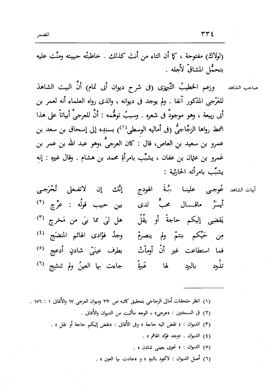 وَزعم الْخَطِيب التبريزي فِي شرح ديوَان أبي تَمام أَن الْبَيْت الشَّاهِد للعرجي الْمَذْكُور آنِفا. وَلم يُوجد فِي ديوانه وَالَّذِي رَوَاهُ الْعلمَاء أَنه لعمر بن أبي ربيعَة وَهُوَ مَوْجُود فِي شعره.