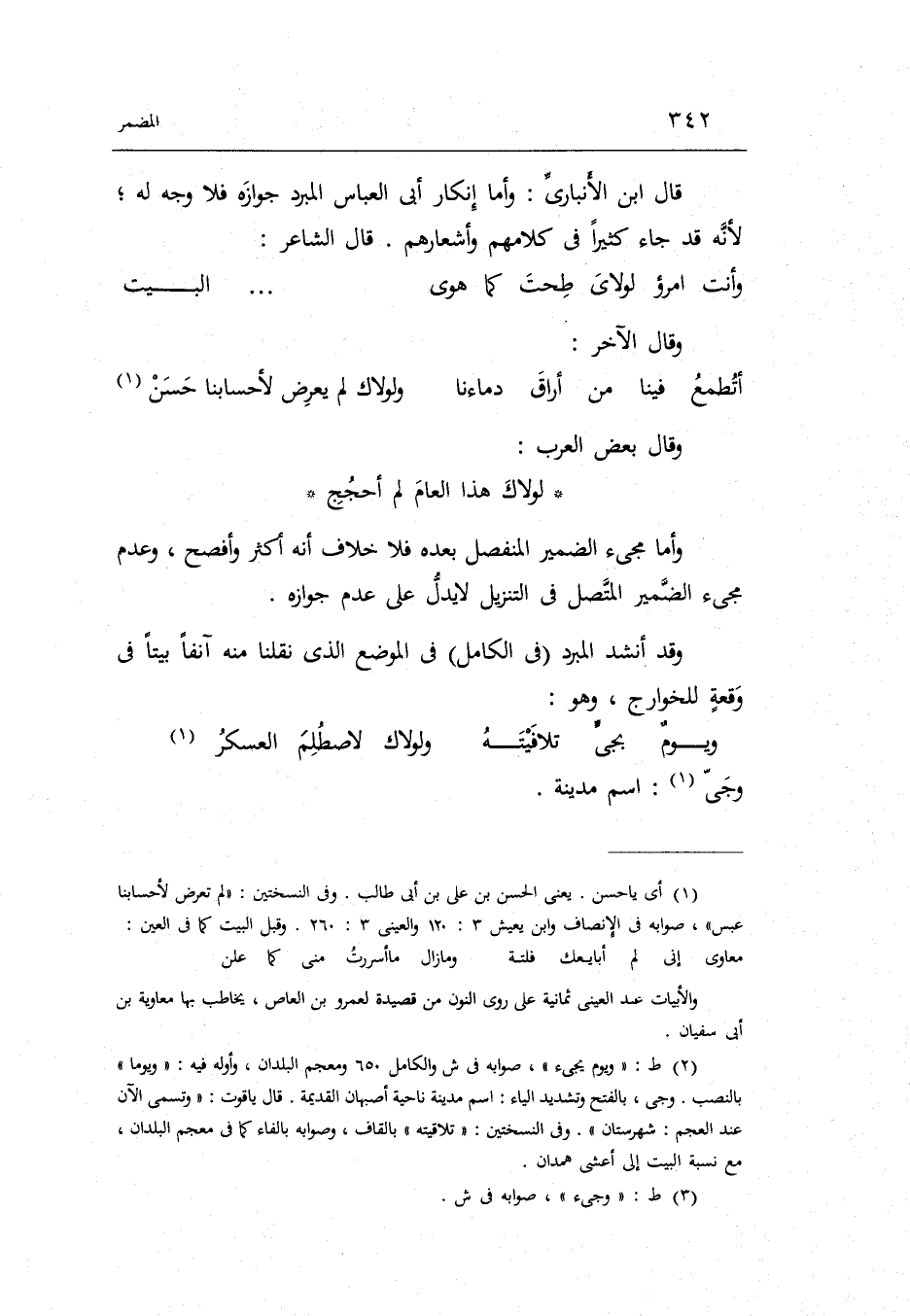 وَقَالَ بعض الْعَرَب: لولاك هَذَا الْعَام لم أحجج وَأما مَجِيء الضَّمِير الْمُنْفَصِل بعده فَلَا خلاف أَنه أَكثر وأفصح وَعدم مَجِيء الضَّمِير الْمُتَّصِل فِي التَّنْزِيل لَا يدل على عدم جَوَازه.