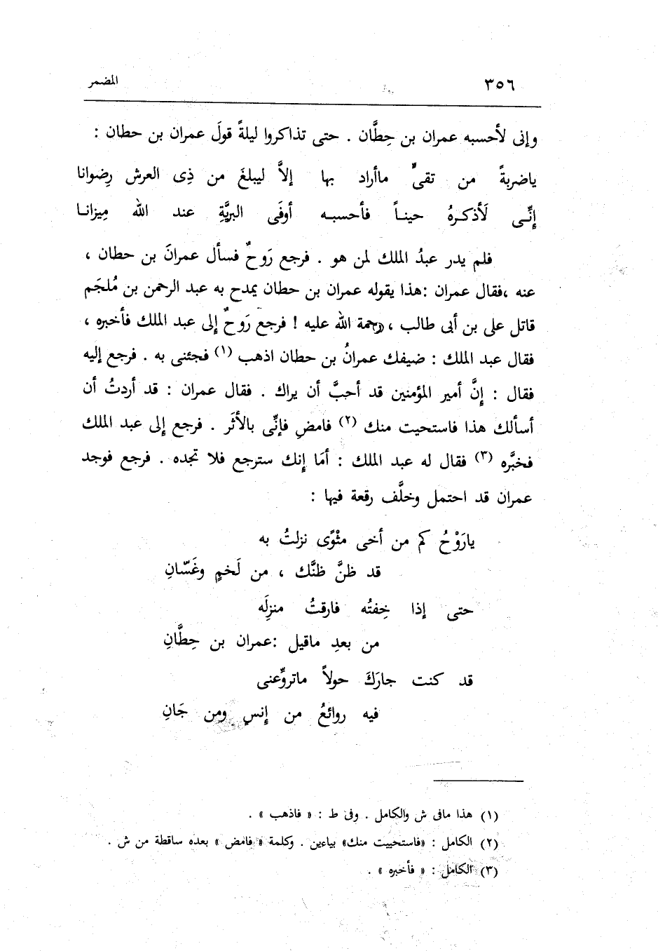 فَقَالَ عمرَان: قد أردْت أَن أَسأَلك هَذَا فَاسْتَحْيَيْت مِنْك فَامْضِ فَإِنِّي بالأثر. فَرجع روح إِلَى عبد الْملك فخبره فَقَالَ لَهُ عبد الْملك: أما إِنَّك سترجع فَلَا تَجدهُ. فَرجع فَوجدَ عمرَان قد احْتمل وَخلف رقْعَة فِيهَا: الْبَسِيط